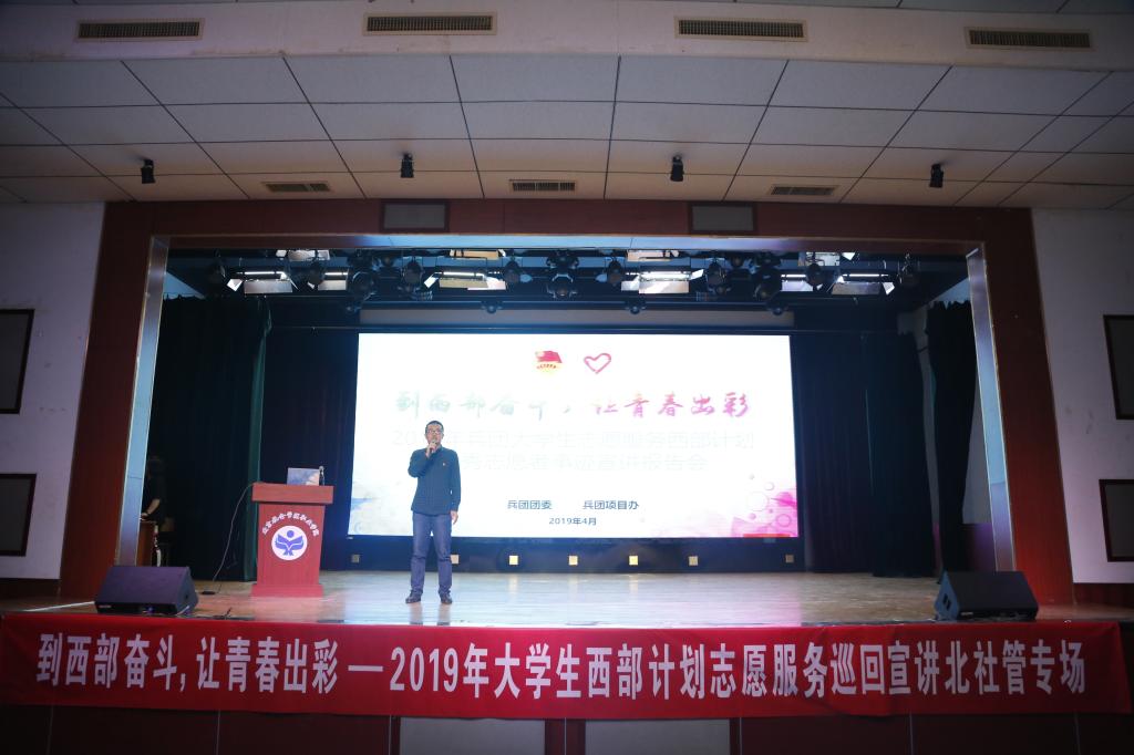 到西部去,到基層去,到祖國最需要的地方去。4月22日晚上18:30,由西部計劃北京項目辦、新疆建設兵團團委、兵團西部計劃項目辦主辦,校團委承辦的“到西部奮鬥,讓青春出彩”2019年兵團大學生志願服務西部計劃優秀志願者事迹宣講會在學術報告廳舉行。兵團第十四師昆玉市團委書記黨學敏一行,學院團委副書記張洪來,院團委相關負責人與全校師生代表300餘人參與了本次活動。