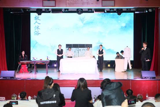 共融篇章中,學生進行了“壯麗七十年,奮鬥新中國”的禮儀展示以及故人沐浴、感悟生命朗誦展示。