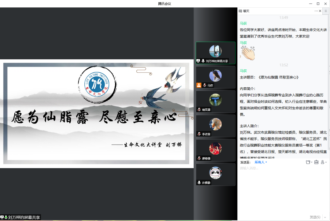 6月28日下午,生命文化學院邀請了優秀畢業生代表劉萬榉在線上為在校生帶來第36期生命文化大講堂,主題為“願為仙脂露、盡慰至親心”。生命文化學院六十多名同學線上聆聽...