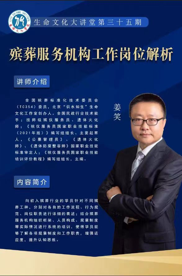 6月23日下午,生命文化學院組織開展第三十五期生命文化大講堂,本次大講堂邀請全國殡葬标準化技術委員會(TC354)委員、全國民政行業技術能手、北京“識水知生”生命文...