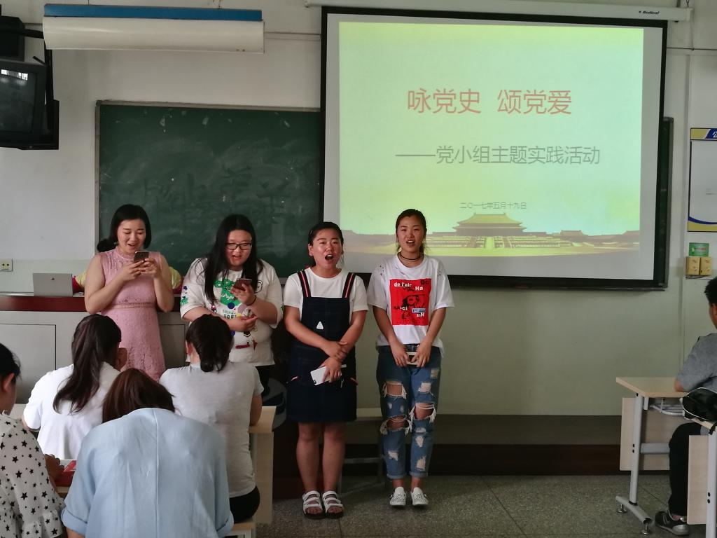 5月19日中午,在教302,第一小組全體同學開展了以“頌黨史 詠黨愛”為主題的實踐活動。同學們以個人或小組形式用唱紅歌、三句半或講革命故事的形式歌頌了偉大的祖國和中國共産黨。紅歌有《歌唱祖國》、《強軍戰歌》、《黃河大合唱》、《團結就是力量》等,詩詞朗誦有《不朽》,革命故事有《長征的故事——七根火柴》、《紅軍》等,還有三句半《黨的十八大》,形式多樣。這些節目的展示旨在引導同學們不忘艱苦曆史,懂得珍惜當下來之不易的幸福生活。